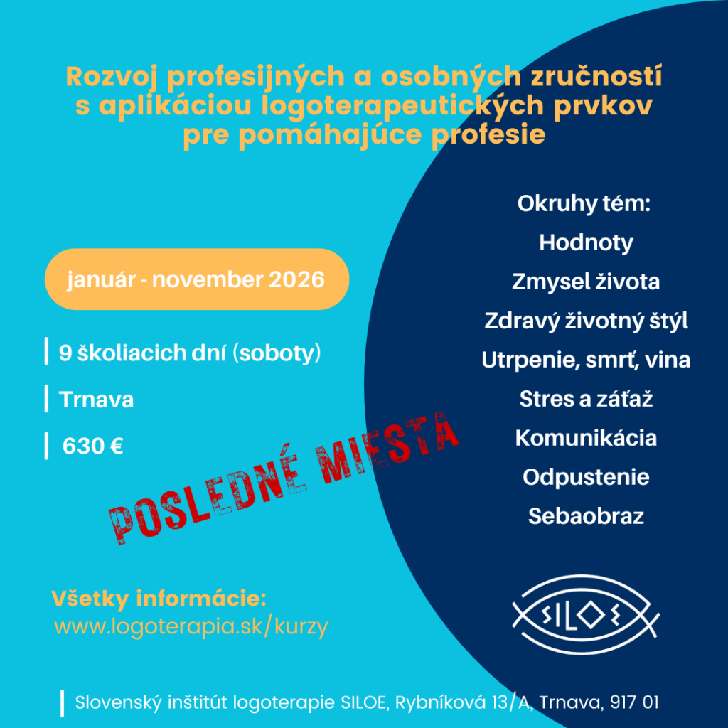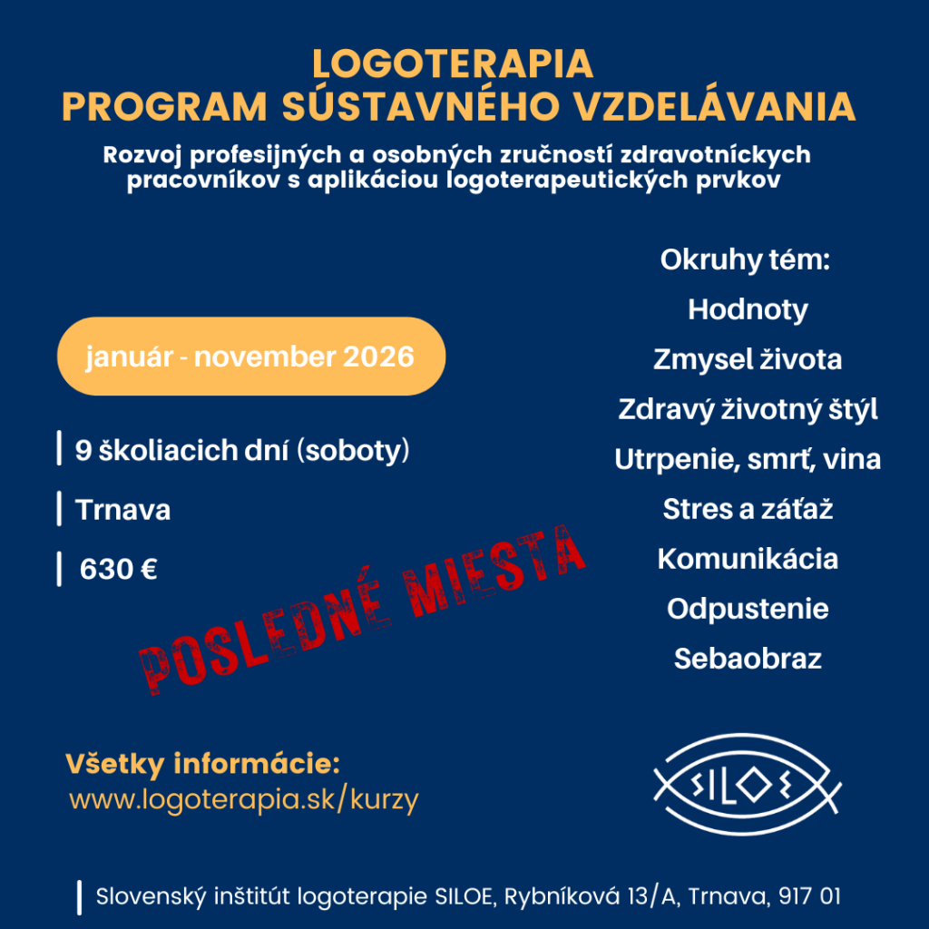 Anotácia: Program sústavného vzdelávania je zameraný na trojdimenzionálne chápanie osobnosti, piliere logoterapeutického prístupu a základné osvojenie teórie V. E. Frankla. Program ponúka rozšírenie zvládacích stratégií pri riešení náročných životných situácii v osobných a profesijných vzťahoch, základné zručnosti rozpoznania manipulatívneho správania, prácu s emóciami. Je zameraný na nové možnosti prekonávania životných neistôt, pocitov strachu, viny, posttraumatický rozvoj človeka. Ponúka prácu s hodnotami a odrývanie osobného zmyslu života.